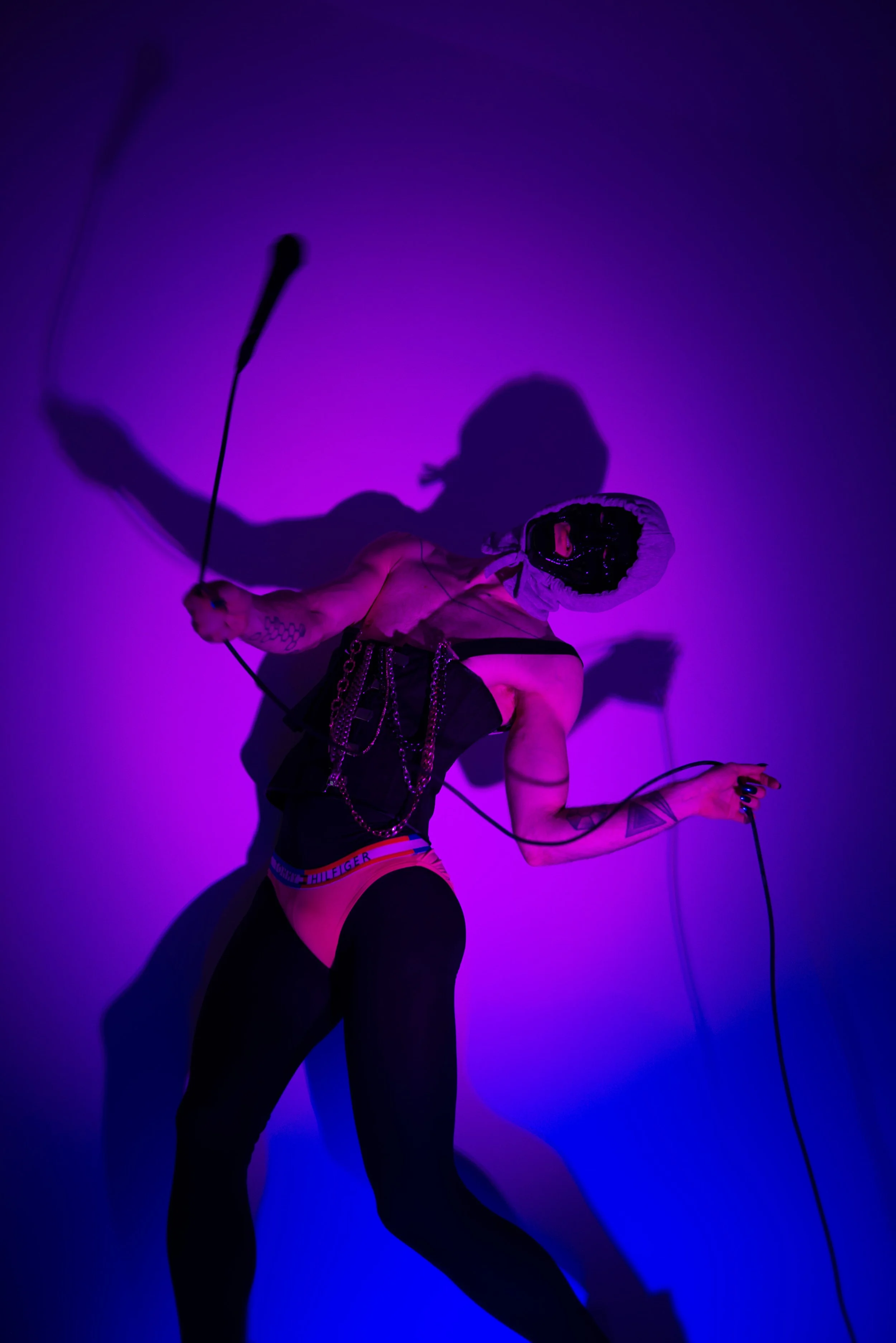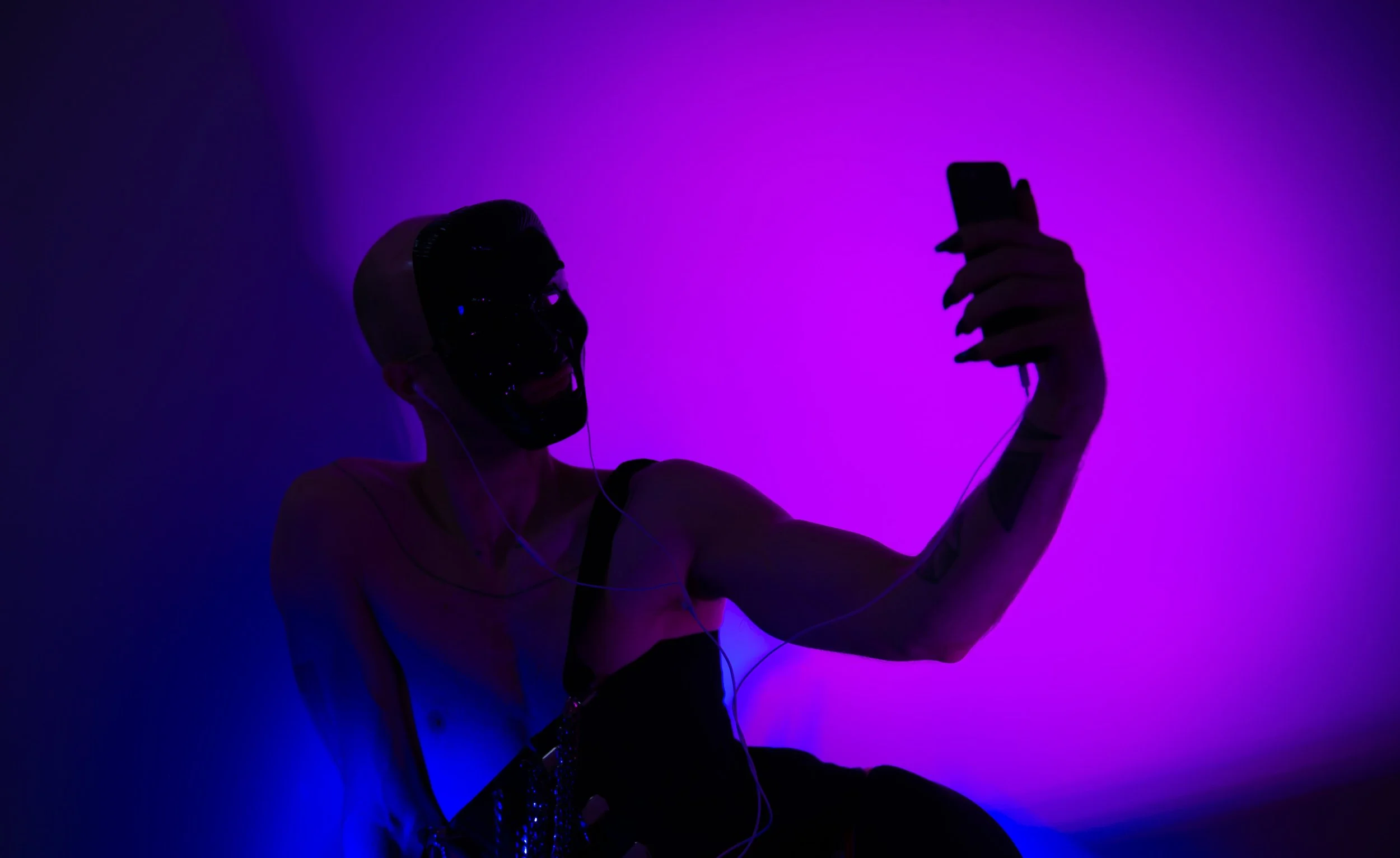 Motyl developed a personal method of working through a dialogue between the body and digital tools such as OBS Studio, Resolume Arena, and DaVinci Resolve. Central to the project is the concept of LIVE PERSONA – a constructed digital identity functioning in real time, shaped by the dynamics of livestream aesthetics, technical limitations, and remote audience engagement.